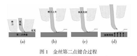 这两类短尾现象产生的机理有所不同。第一类短尾形成的原因主要是尾线与劈刀之间的粘附力和摩擦力偏高,或者尾线与焊盘和金丝鱼尾部分之间的拉脱力偏低。导致即使线夹处于开启状态,劈刀向上拉起动作仍然可以把尾线从焊盘上带起,这样,就无法通过向上拉起劈刀的动作,形成图1(c)中较长的尾线;第二类短尾的形成,发生在扯线过程中,通过劈刀拉起和线夹关闭的动作,尾线已经在劈刀外预留了足够长。但可能由于键合参数不当,或者金丝